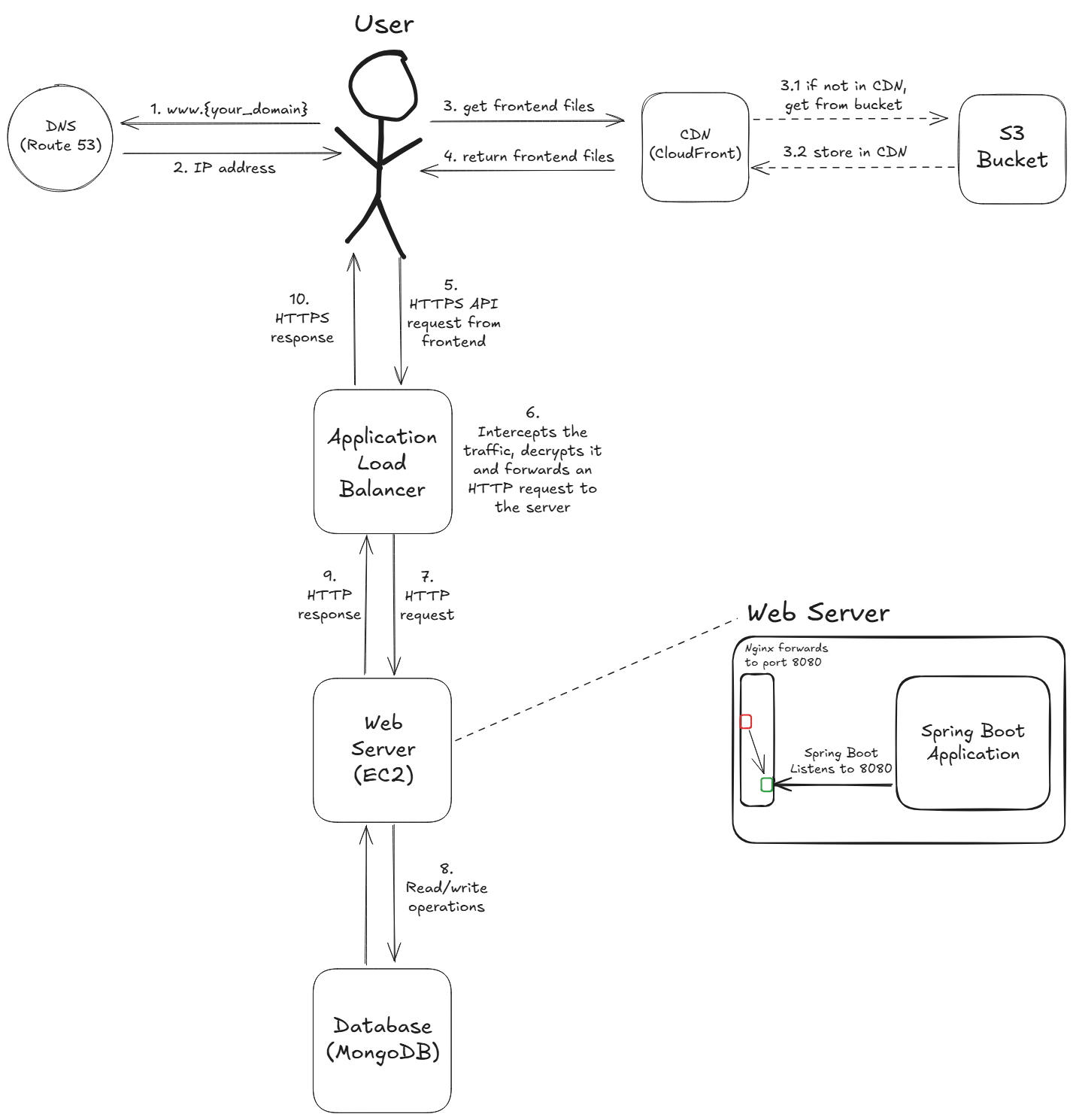 - API calls: Frontend -> ALB (Load Balancer) -> Nginx (EC2) -> Spring Boot -> MongoDB