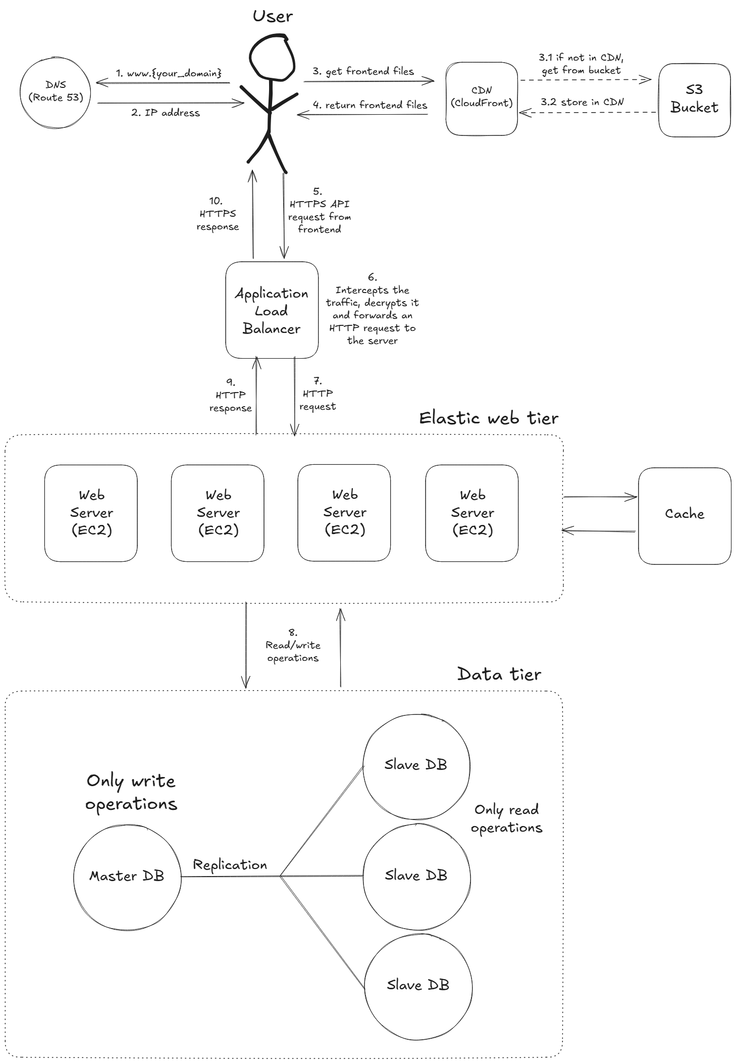 - DNS Lookup (frontend): the user enters www.{your_domain} into their browser. The browser sends a request to Route 53 (our DNS service) to find where the domain is located.