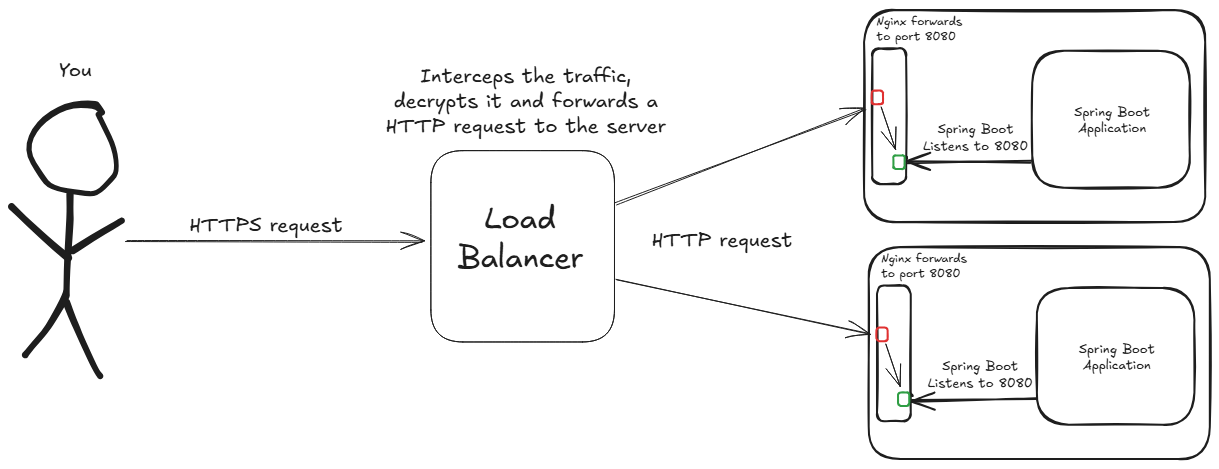 - SSL/TLS Termination: the Application Load Balancer (ALB) receives this encrypted request. It performs SSL/TLS Termination, meaning it decrypts the traffic.
